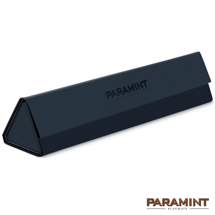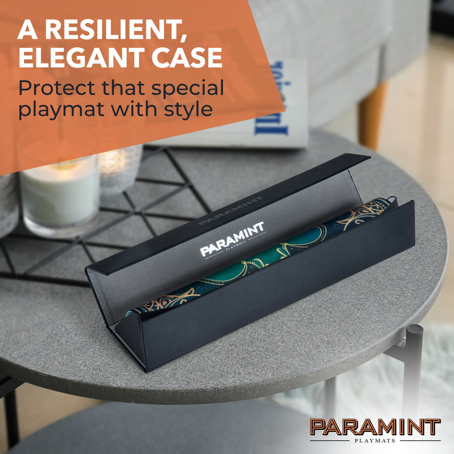 Durable playmat case with a magnet closure to seal your MTG playmat securely and conveniently with a snap. Made of smooth fabric interior and non-slip leatherette or satin exterior for heavy grip on playing surface.
